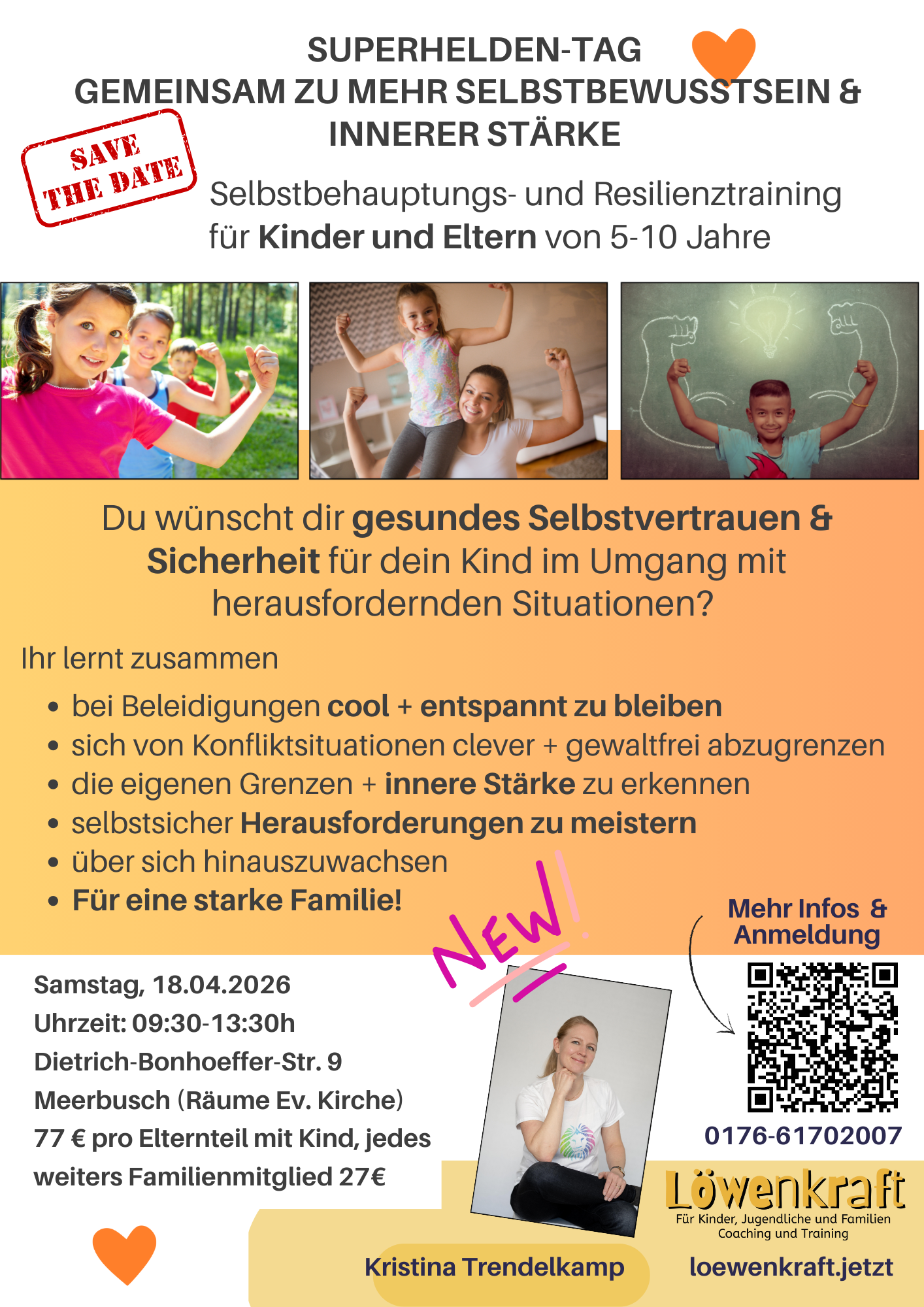 Superhelden-Tag (Eltern-Kind Event) Training zur Stärkung der Resilienz und des Selbstvertrauens | Samstag, 18.04.2026 Samstag, 14.11.2026 | Meerbusch Büderich | Kinder von 5-10 Jahre | |